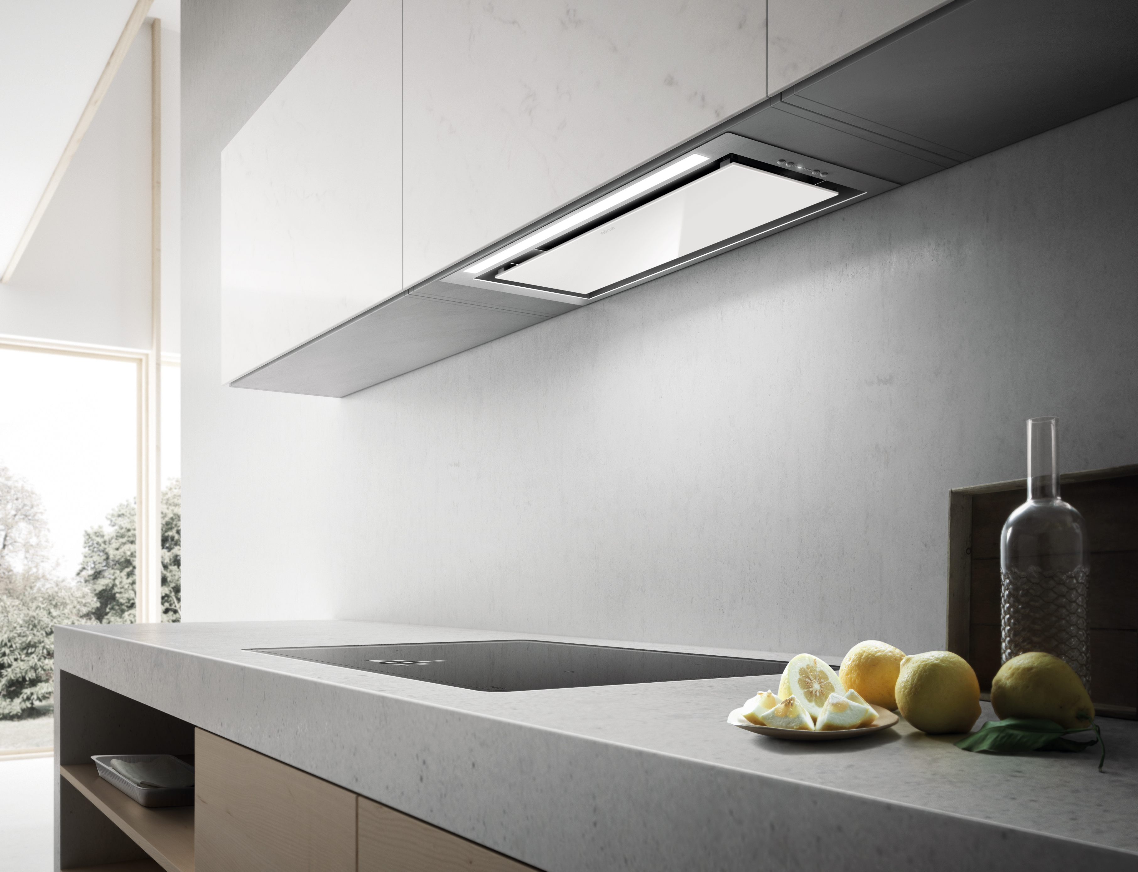 A sleek, concealed hood available in stainless steel, matte black, and white glass/stainless steel finishes, featuring diffuse LED lighting and touch controls.